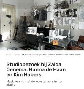 - 17 december 19:30 (online) studiogesprek – studiobezoek bij Zaida Oenema, Hanna de Haan en Kim Habers. aanmelden via Kunstenlab.nl