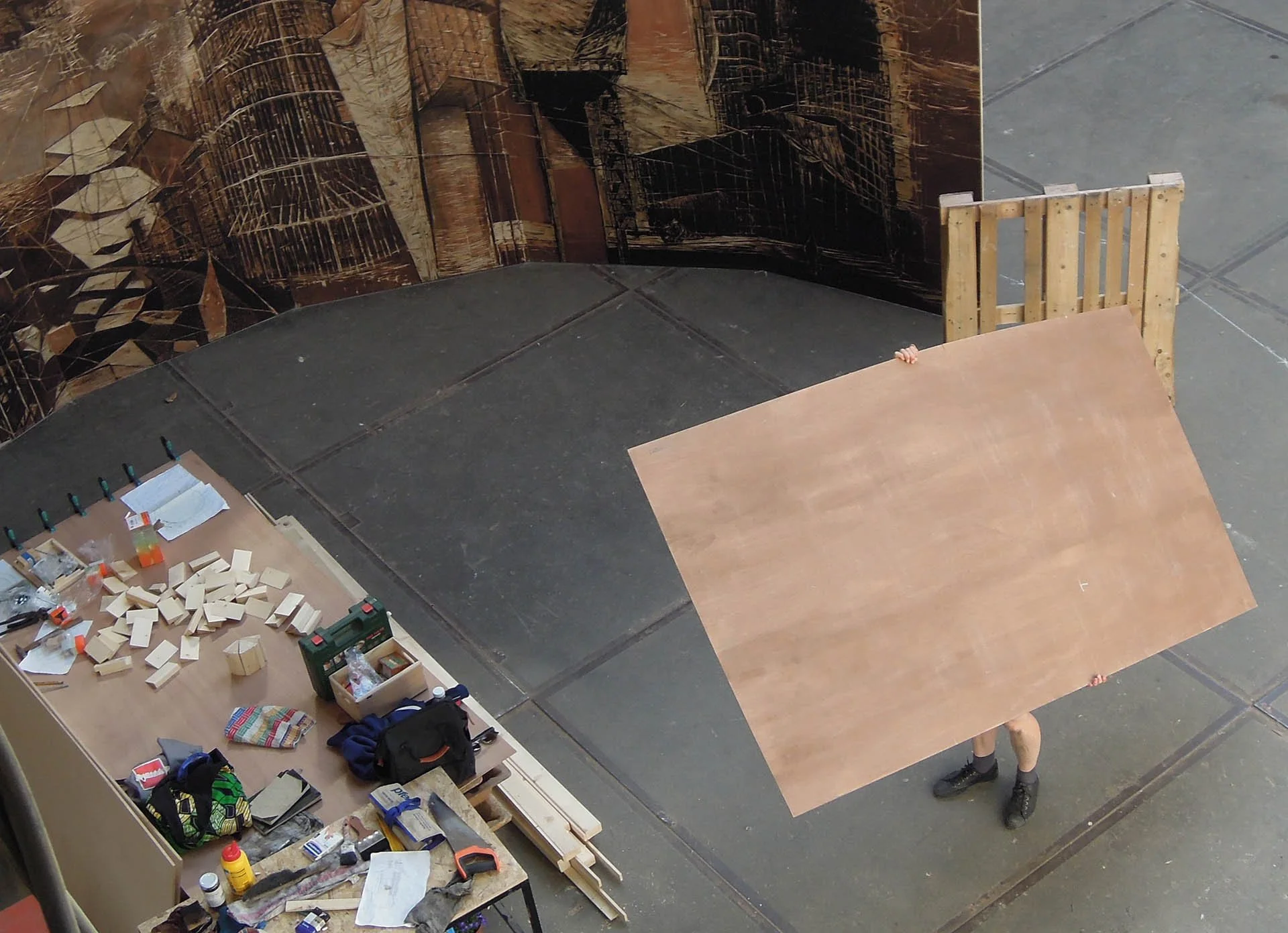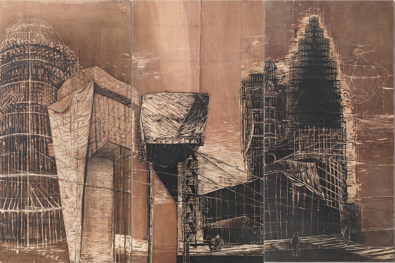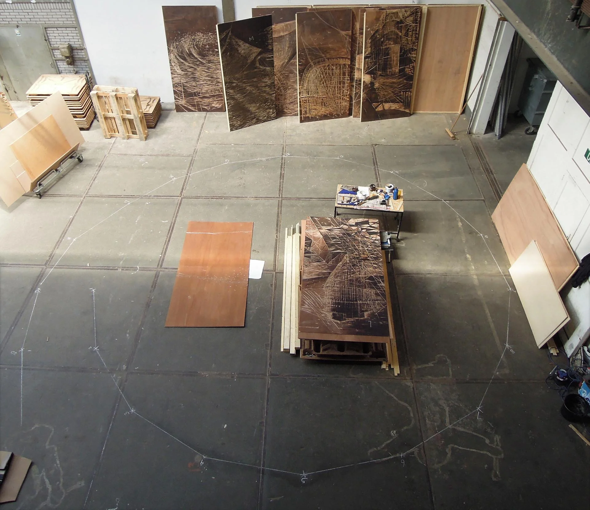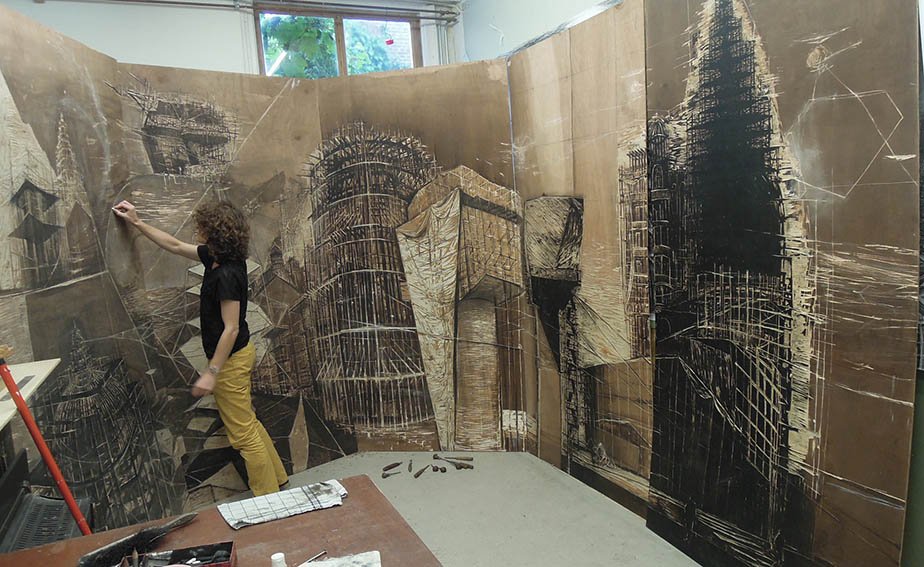 Everything is in motion. Existing buildings are wrapped in scaffolding, new architecture is under construction, helicopters are approaching, and the waves are turbulent. In 2018, Hanna de Haan created a circular installation made of 20 large wooden panels (2,4×1,2 m), with a diameter of 7 meters, in which you literally walk through an imaginary city by the sea. The arrangement in a circle, which the visitor enters, gives a refreshing twist to the panoramic form and traditional technique. Instead of an illusion, the viewer is fully aware of the technique and the material.