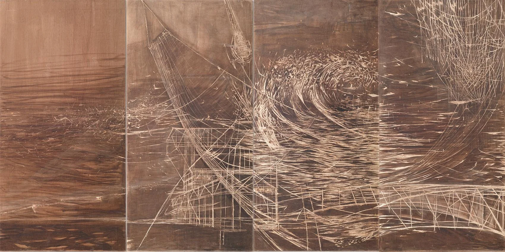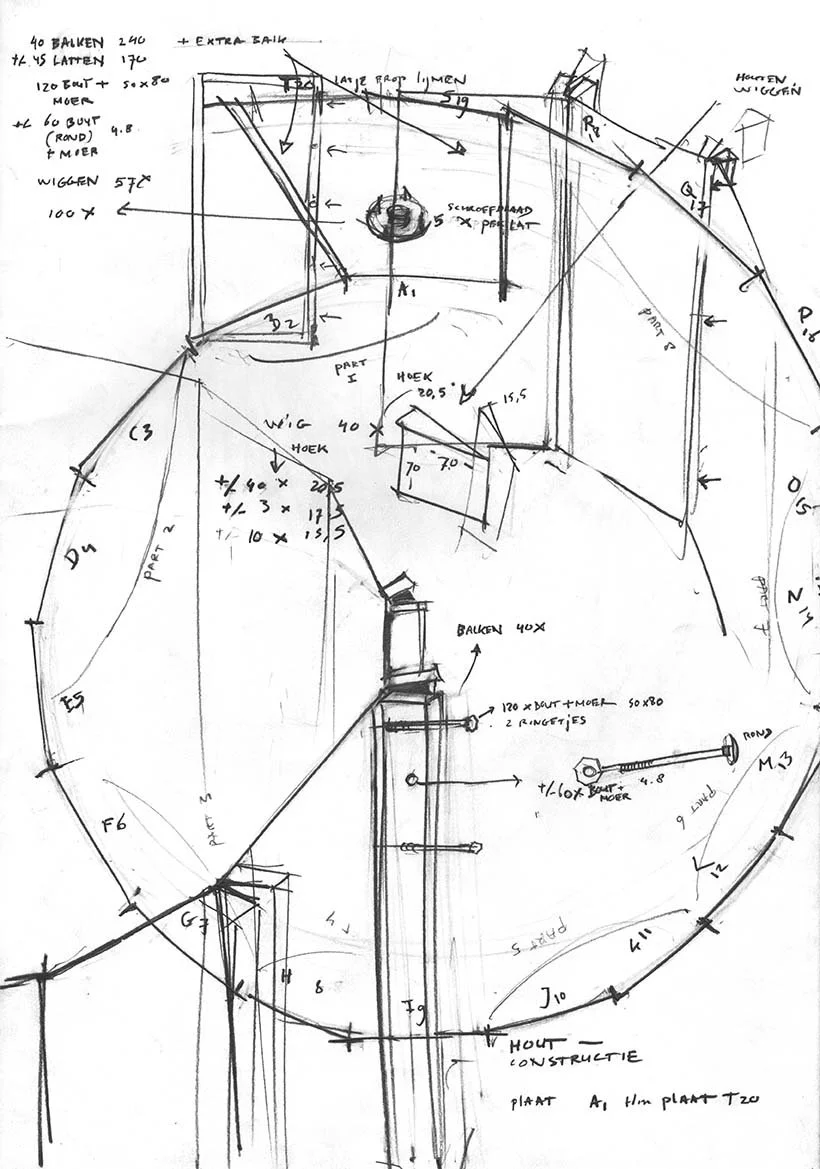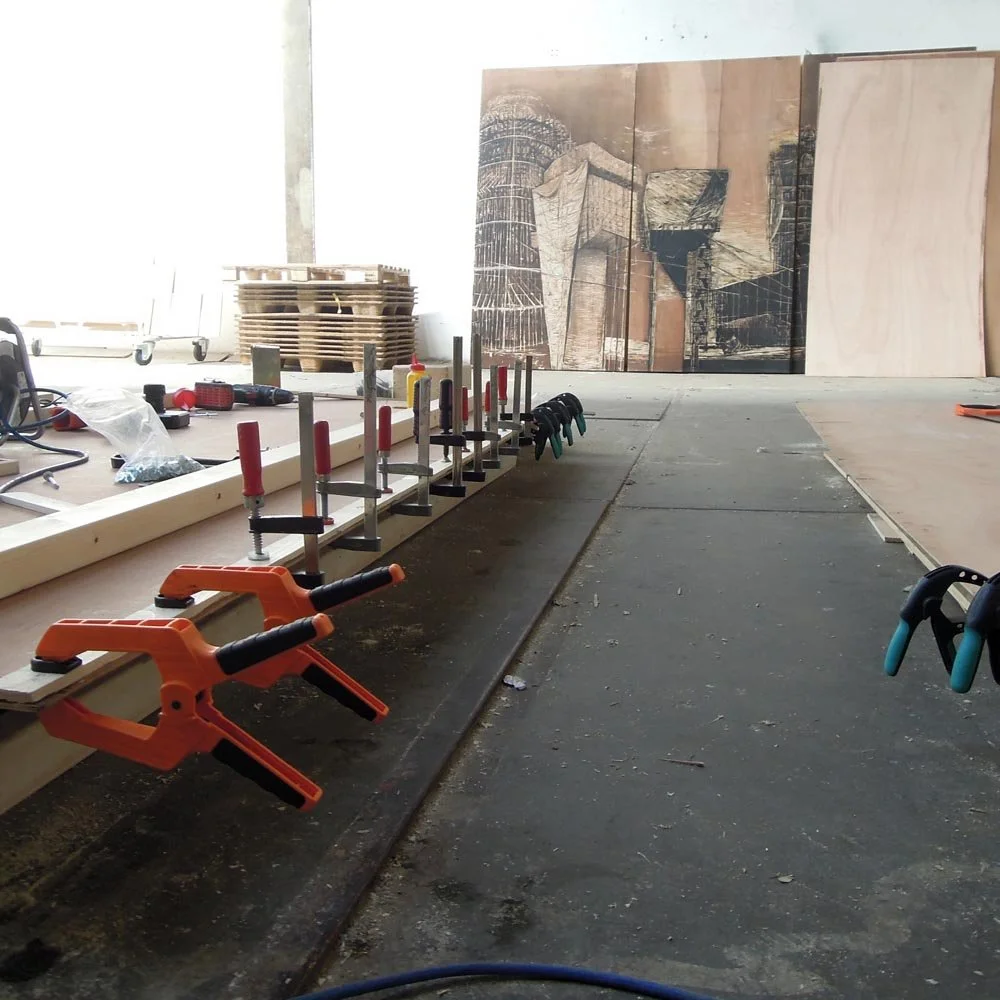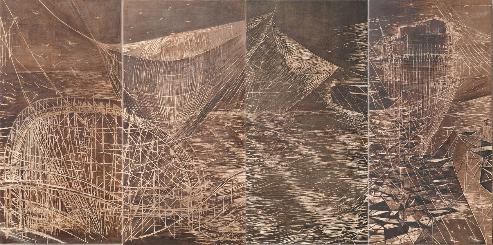 Everything is in motion. Existing buildings are wrapped in scaffolding, new architecture is under construction, helicopters are approaching, and the waves are turbulent. In 2018, Hanna de Haan created a circular installation made of 20 large wooden panels (2,4×1,2 m), with a diameter of 7 meters, in which you literally walk through an imaginary city by the sea. The arrangement in a circle, which the visitor enters, gives a refreshing twist to the panoramic form and traditional technique. Instead of an illusion, the viewer is fully aware of the technique and the material.